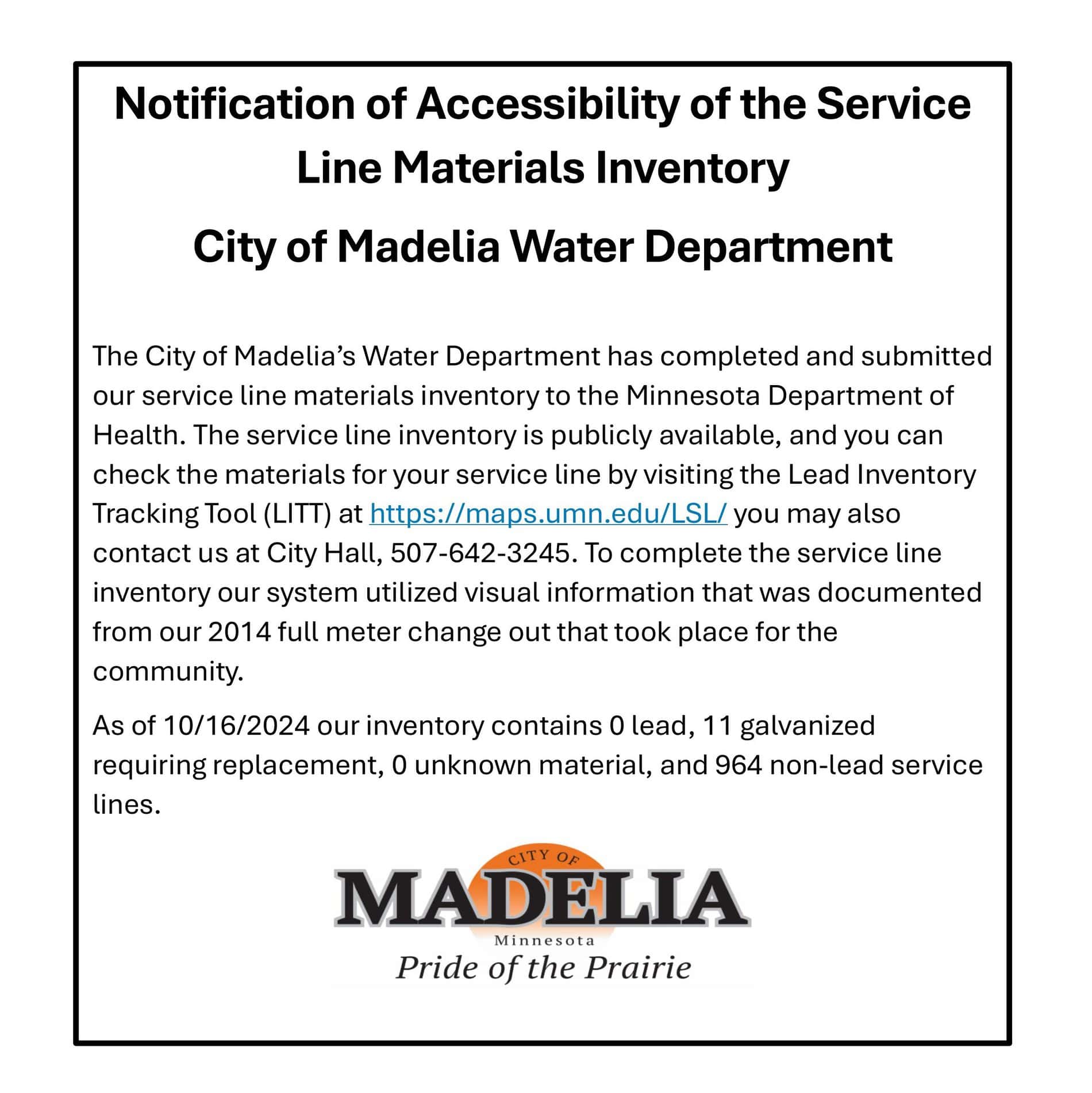 Notification of Service Line Materials Inventory Find out if you have a lead service line City of MadeliaNovember 14th, 2024|Uncategorized| Share this Event! FacebookX